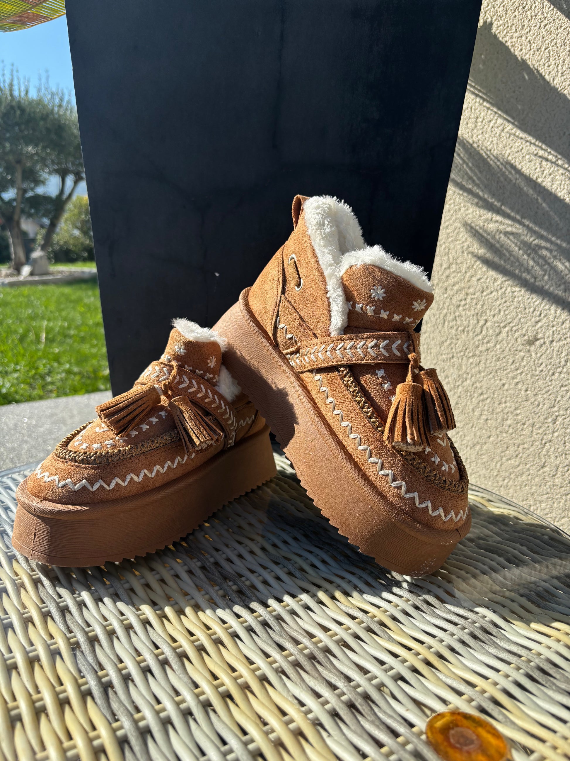 Bottines fourrées Camel avec surpiqures blanches. Petit nœud sur le devant. A l'intérieur de la chaussure moumoute blanche. Du 37 au 41. Chaude.