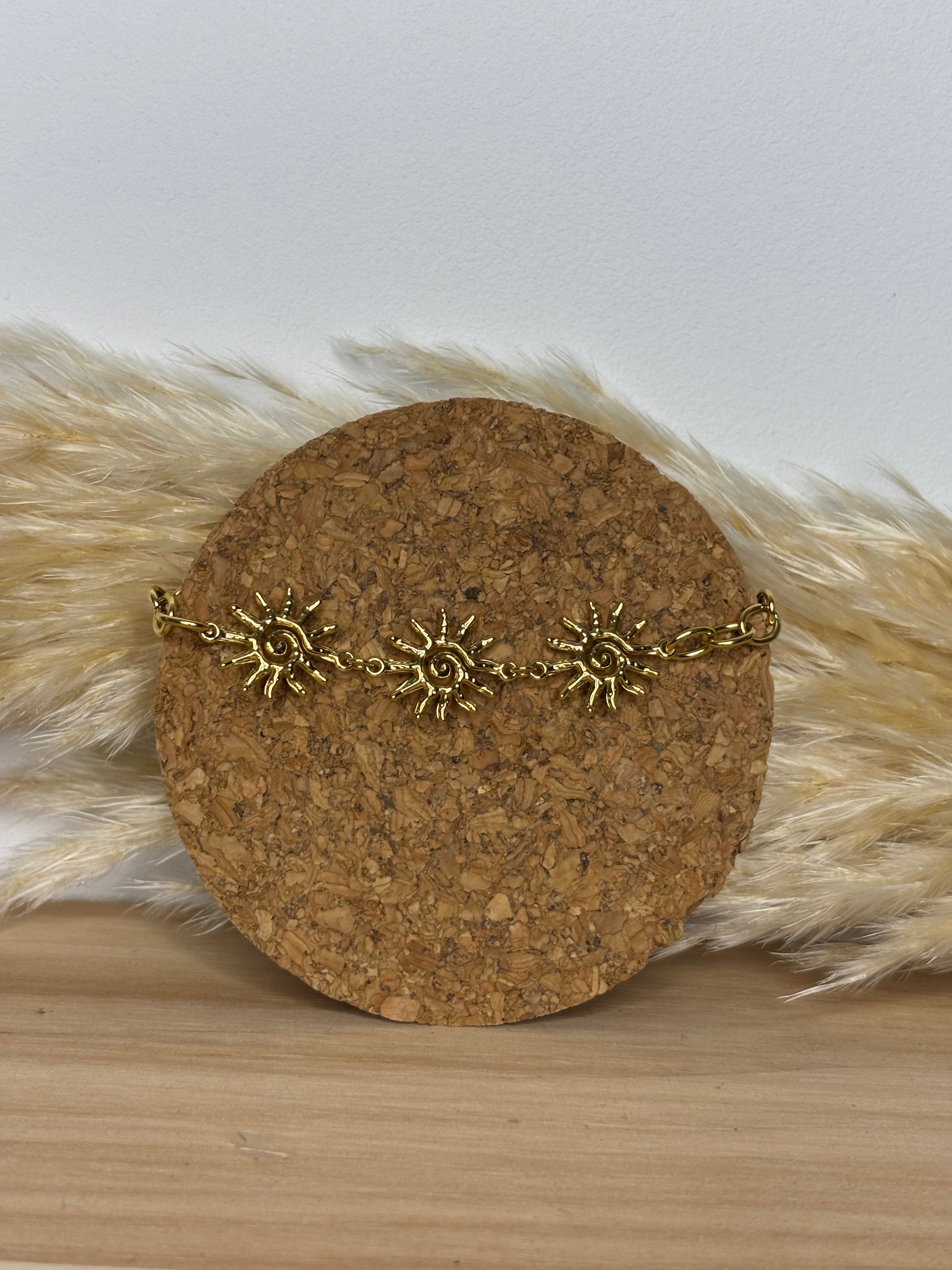Bracelet en acier doré inoxydable avec 3 soleils existe en acier doré, réglable.