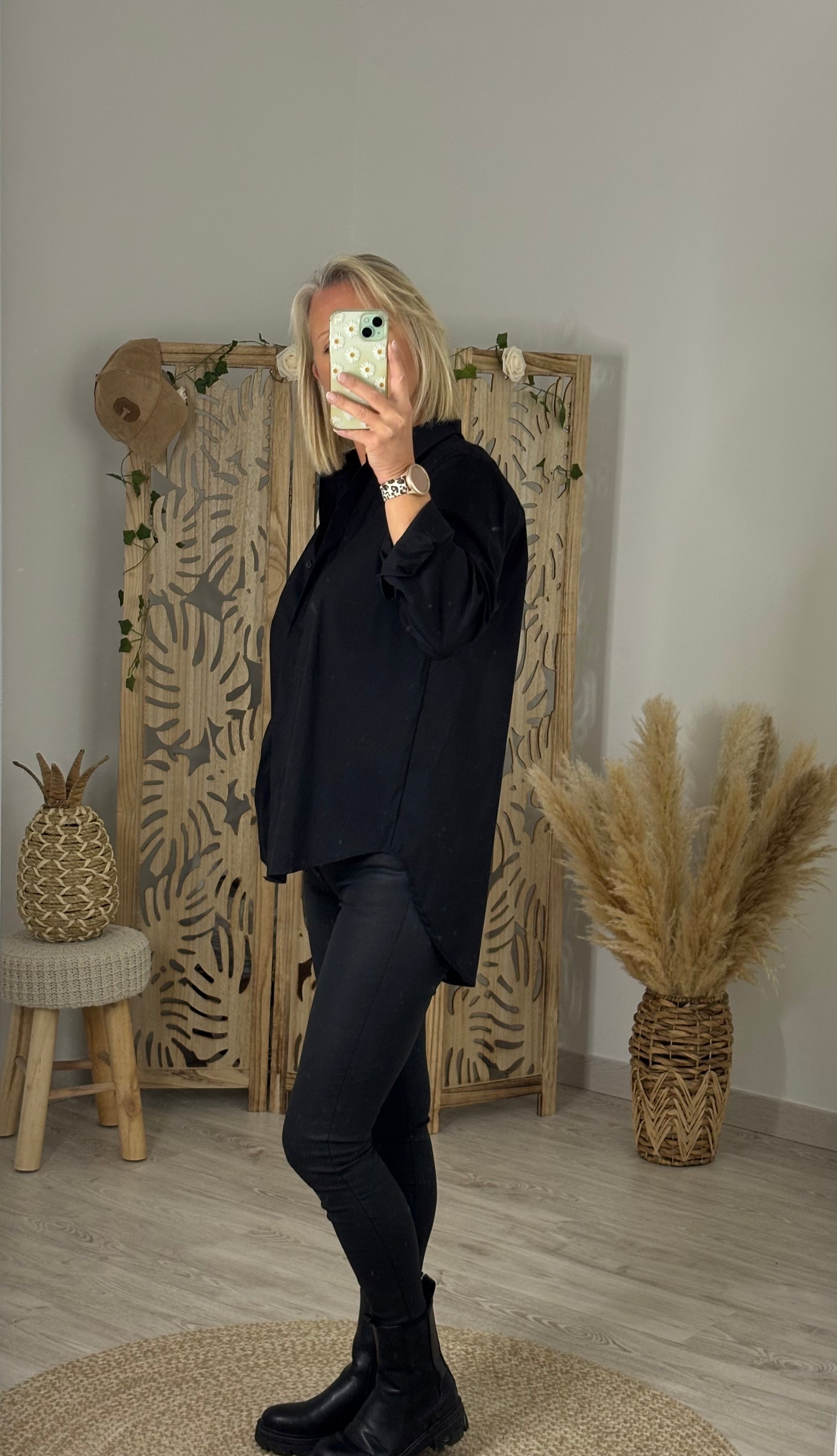 Chemise basique noire boutonnée sur le devant, plus longue sur l'arrière. Taille unique convient du 36 au 42. Existe en plusieurs coloris.