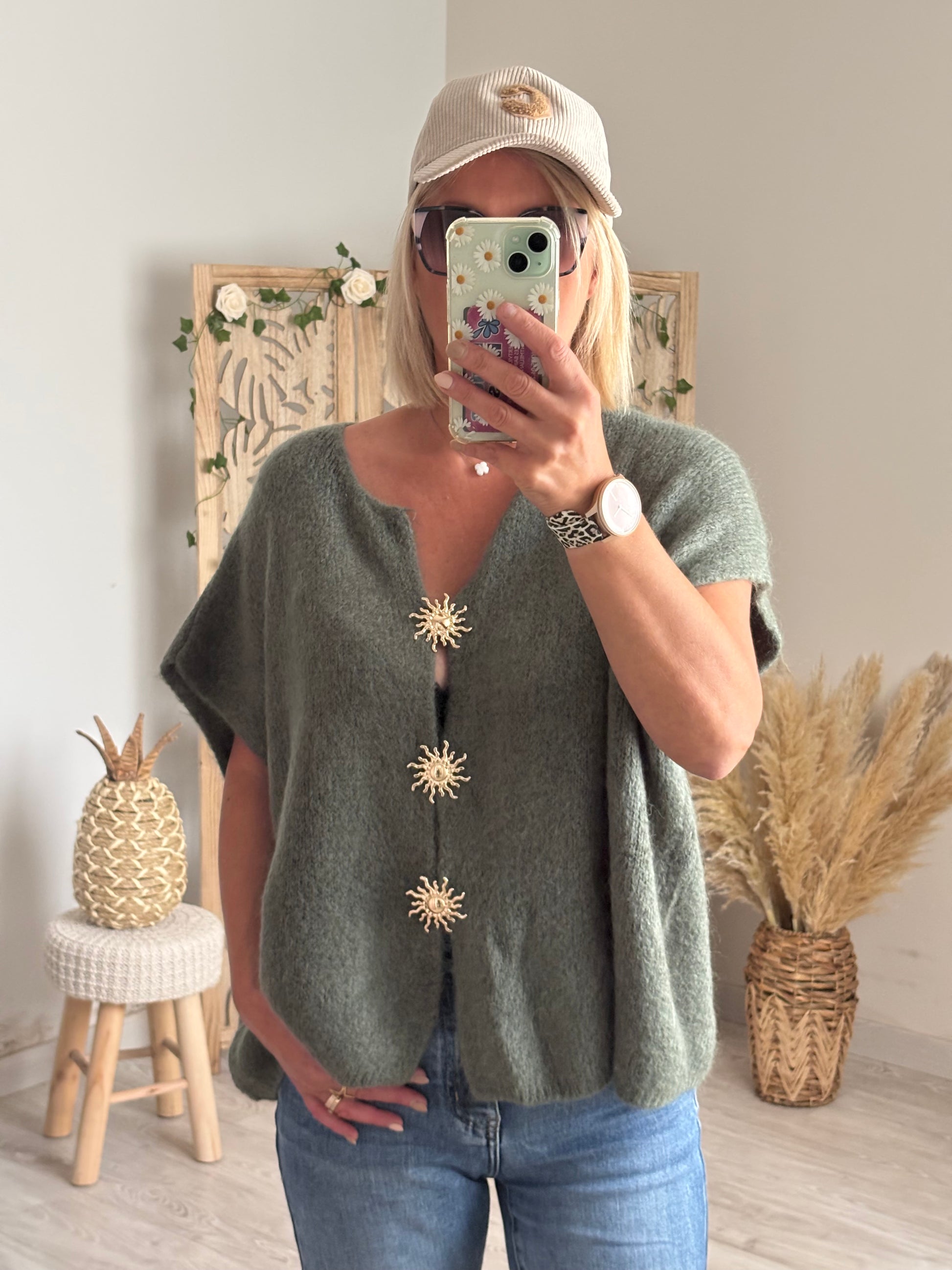 Gilet loose manches courtes en maille moelleuse kid mohair avec 3 broches soleil. Existe en plusieurs coloris. Taille unique convient du 36 au 46.