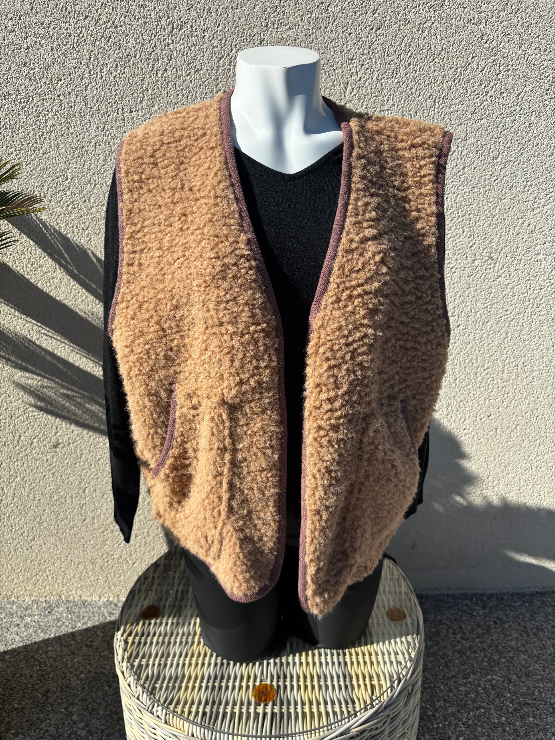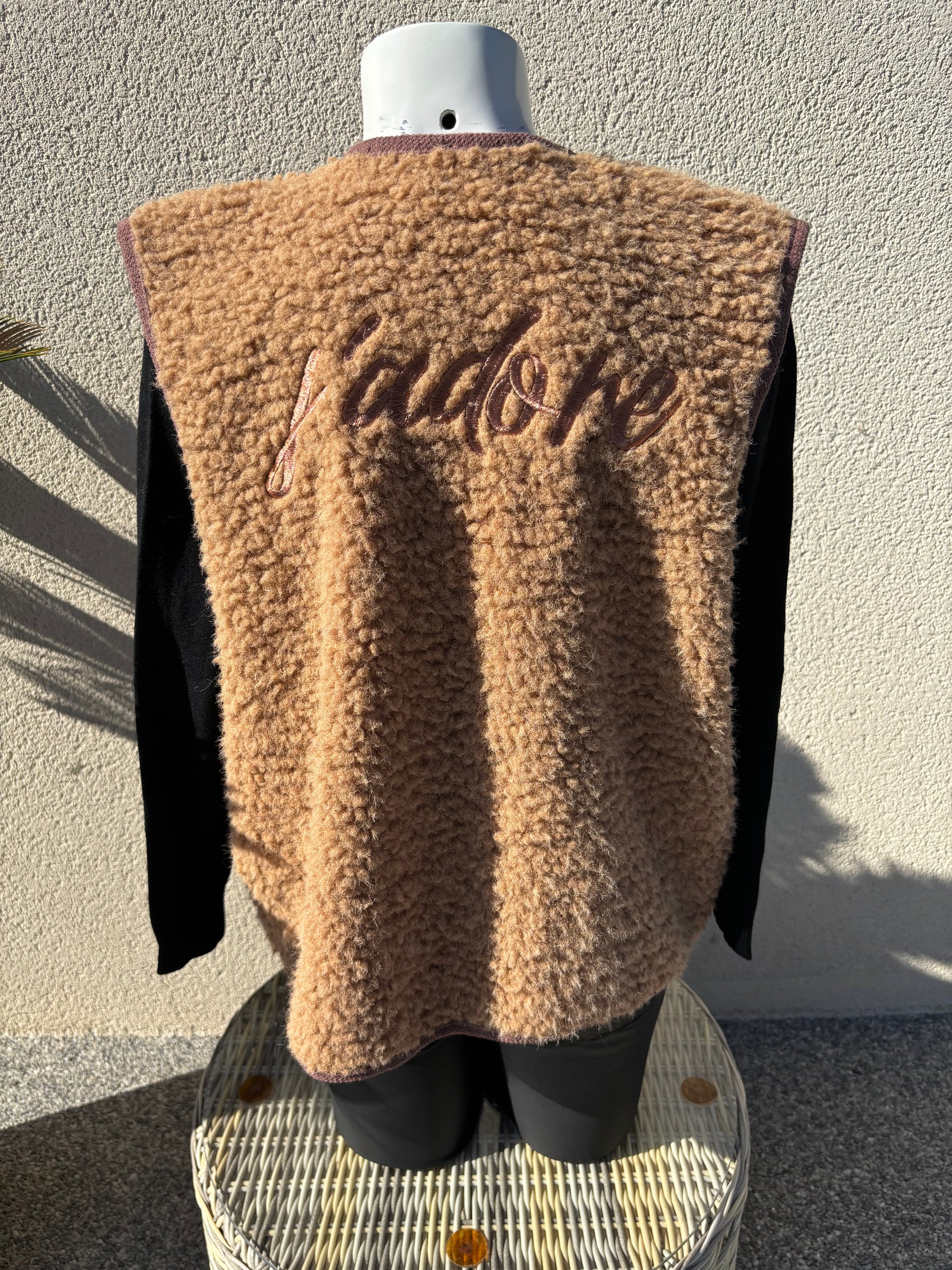 Gilet en moumoute Camel avec inscription au dos j'adore. 2 poches sur le devant. Taille unique convient du 36 au 46.
