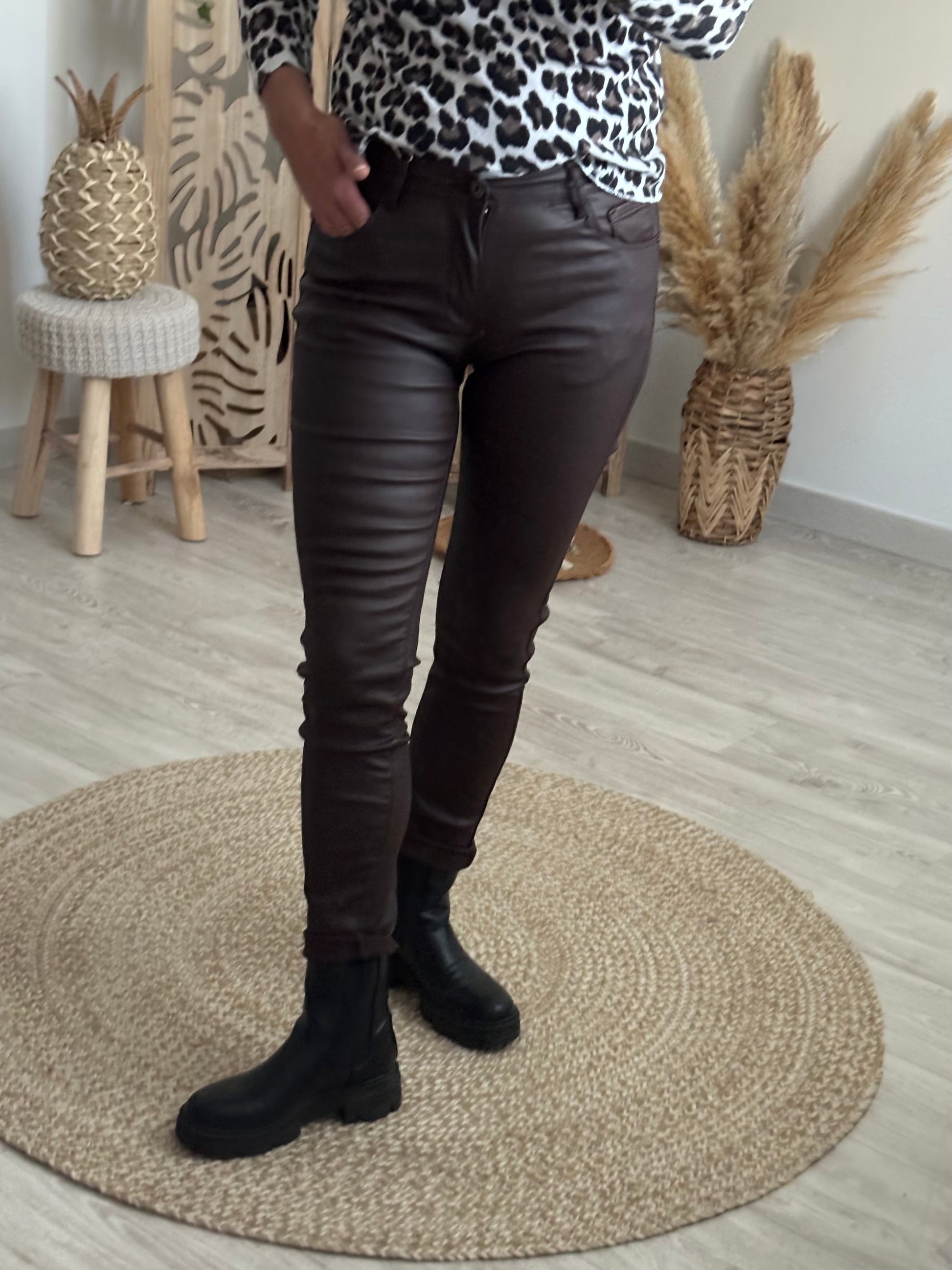 Pantalon simili ou enduit en slim marron. Fermeture éclair avec bouton. 2 poches sur le devant et l'arrière. Existe en 2 coloris.