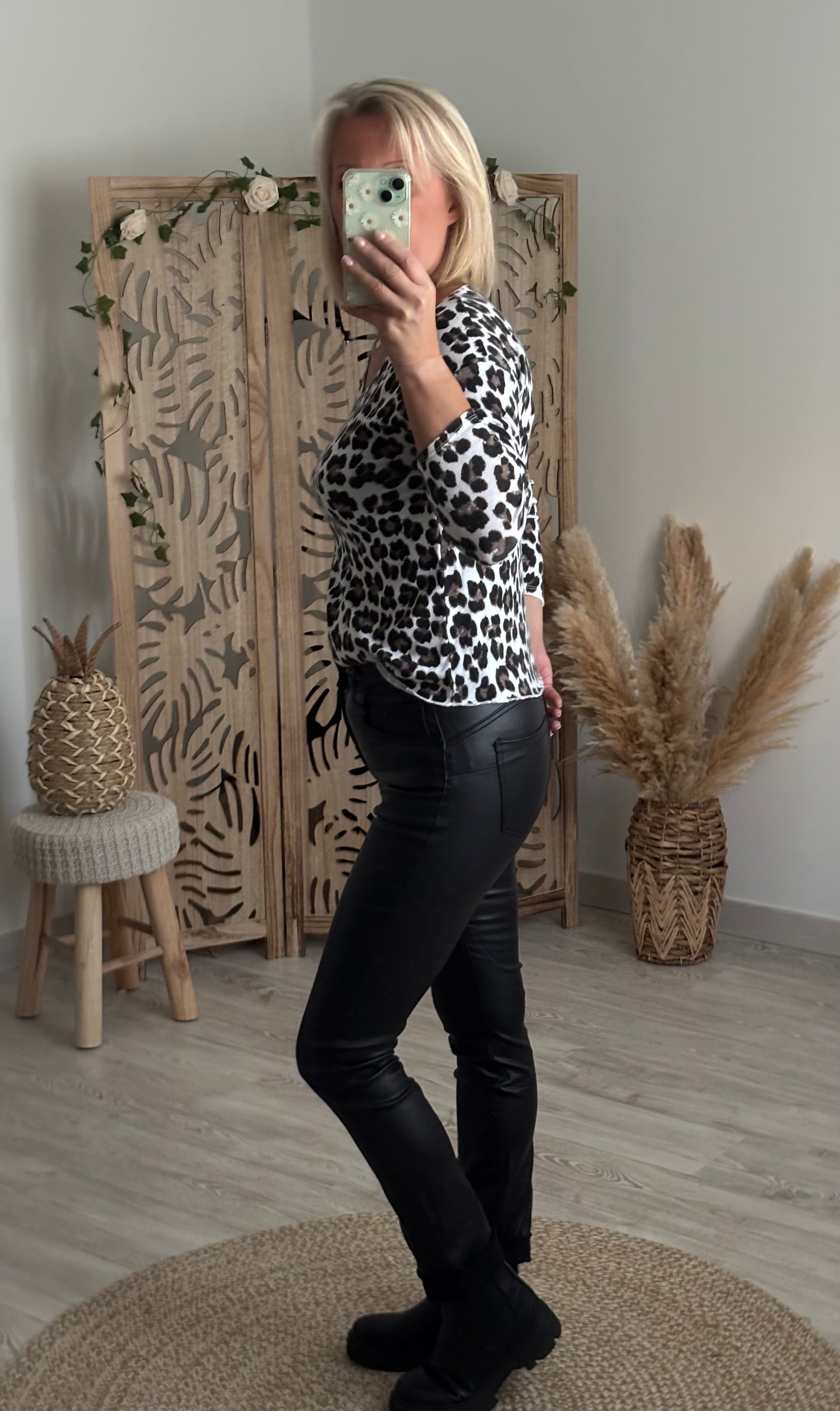 Pantalon simili noir droit/slim avec fermeture éclair et bouton. poches sur le devant et l'arrière. Existe qu'en noir.