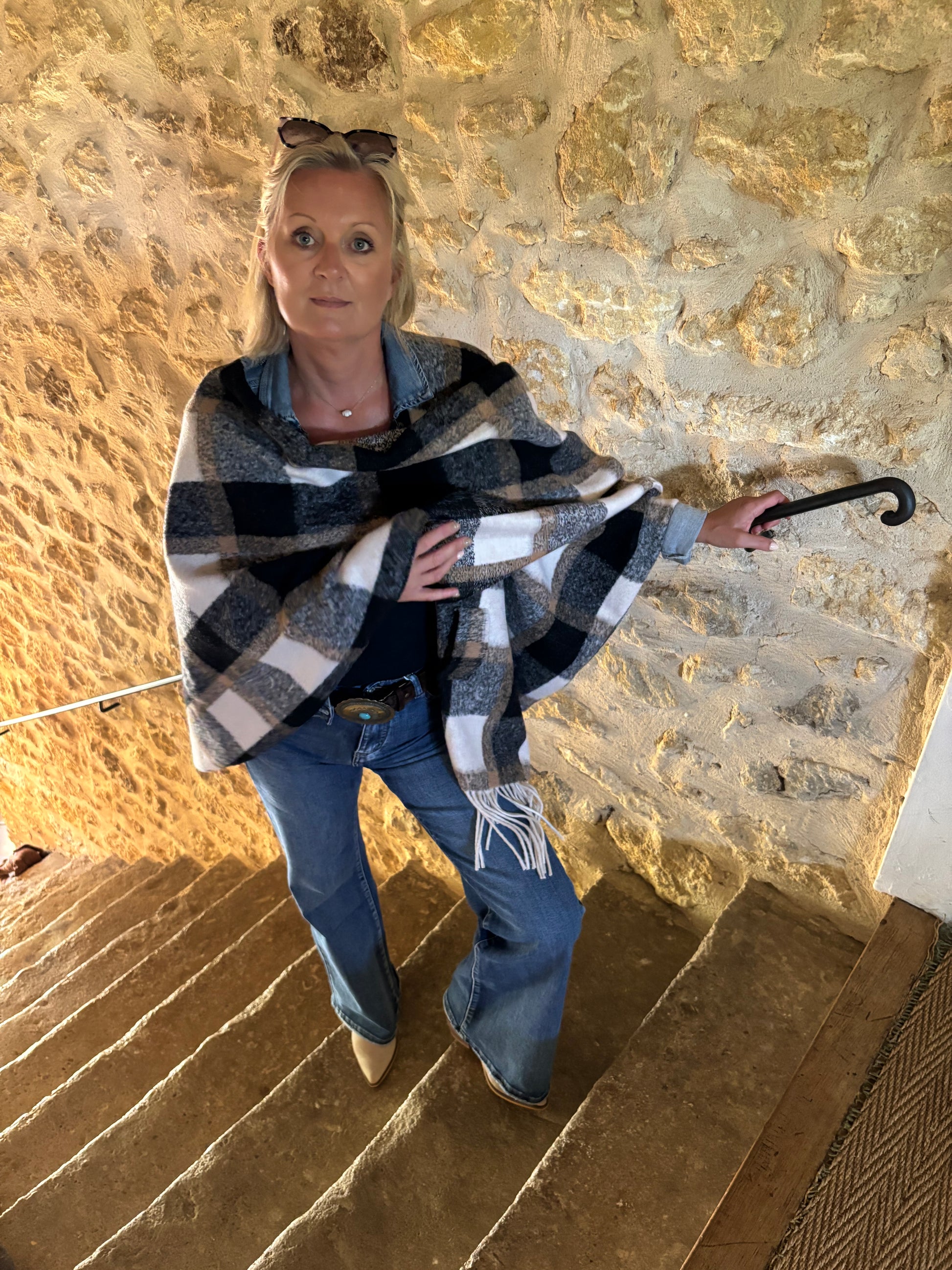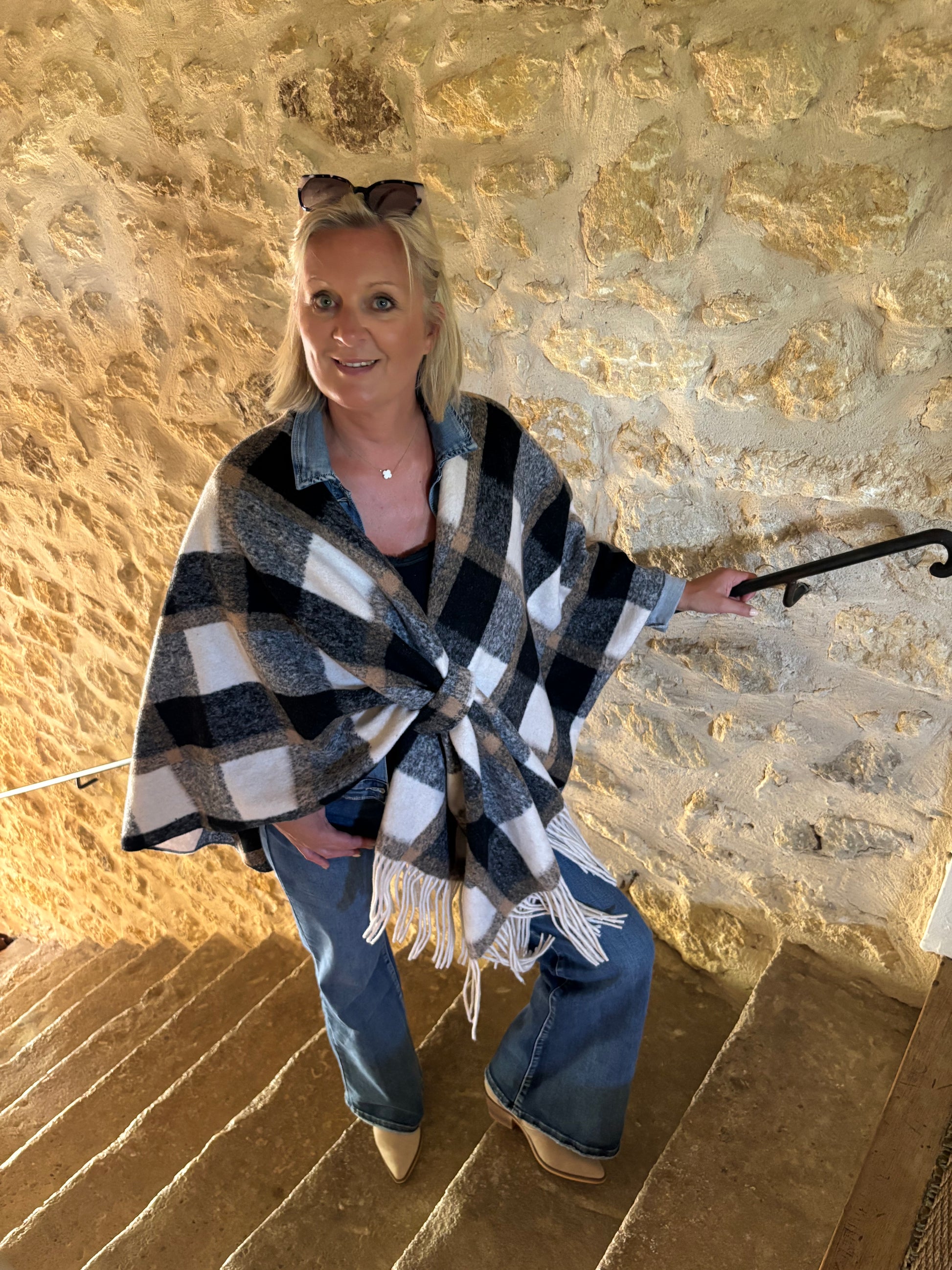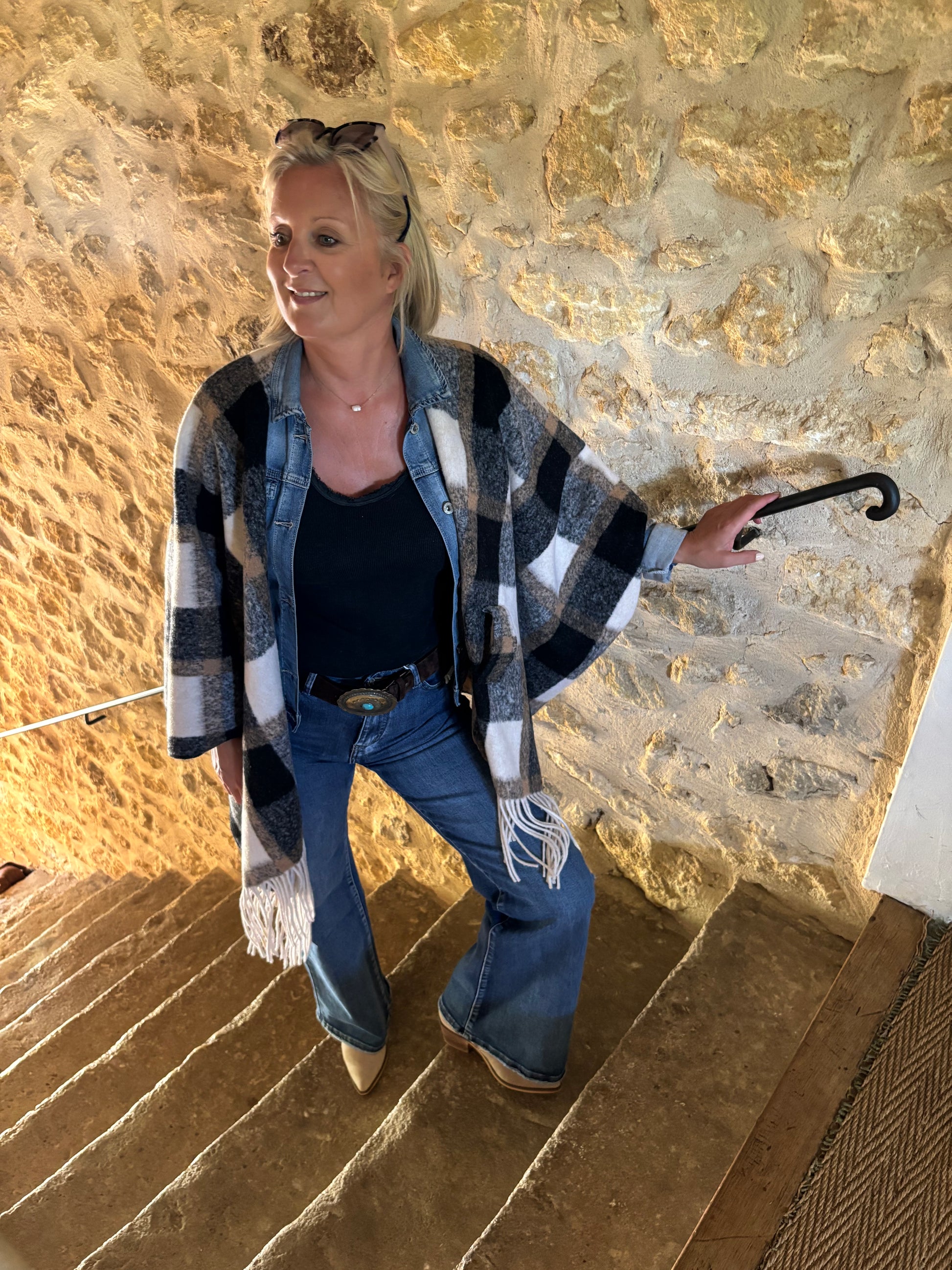 Poncho/ cape à franges /carreaux, se referme sur le devant avec une boucle. Taille unique .