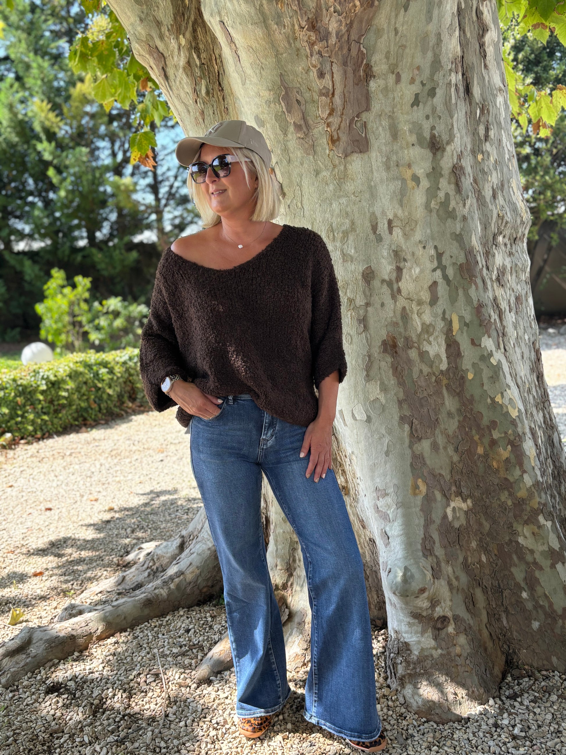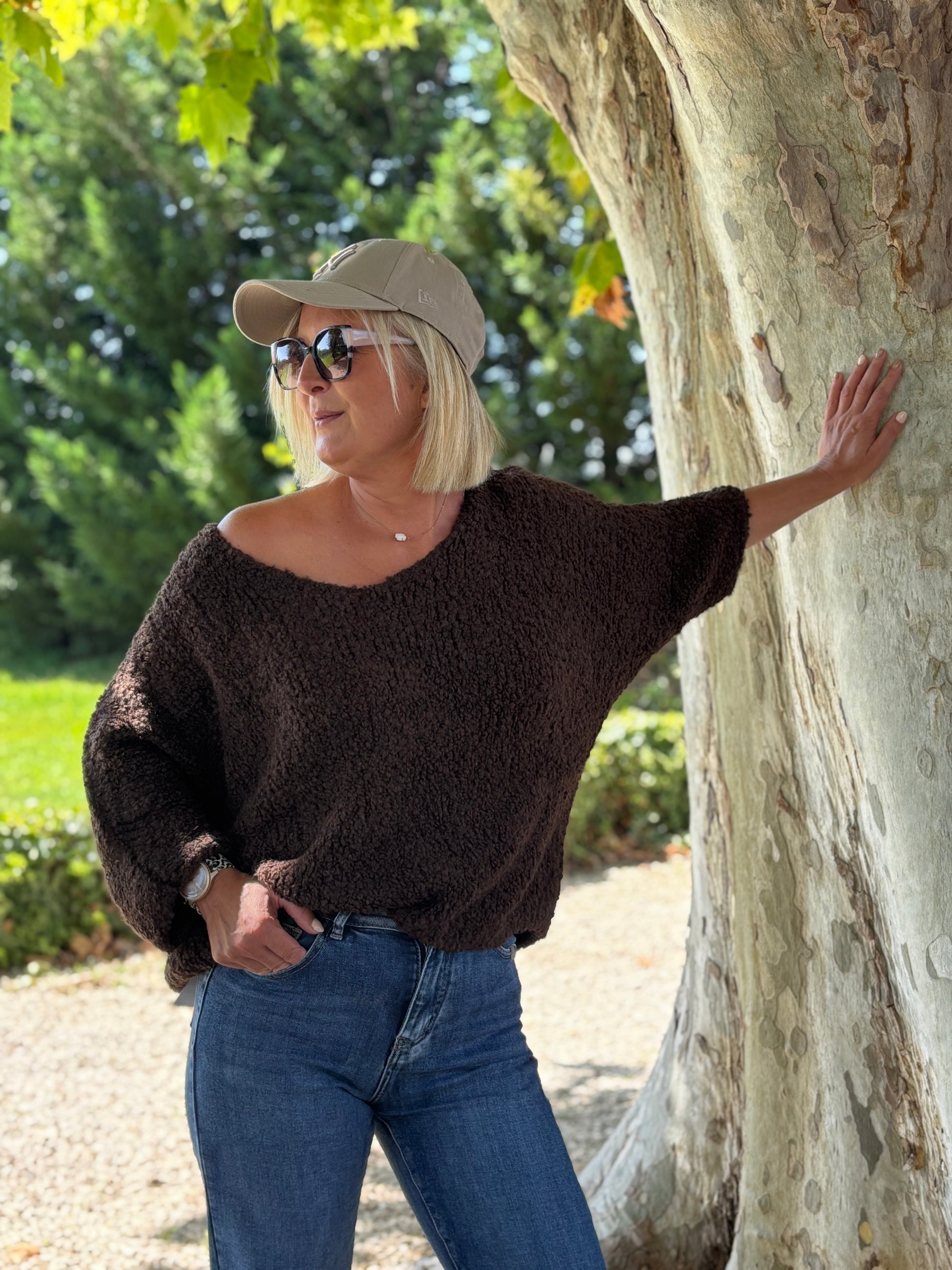 Pull maille bouclette, col V, coupe oversize, taille unique convient du 36 au 44. Existe en plusieurs coloris.