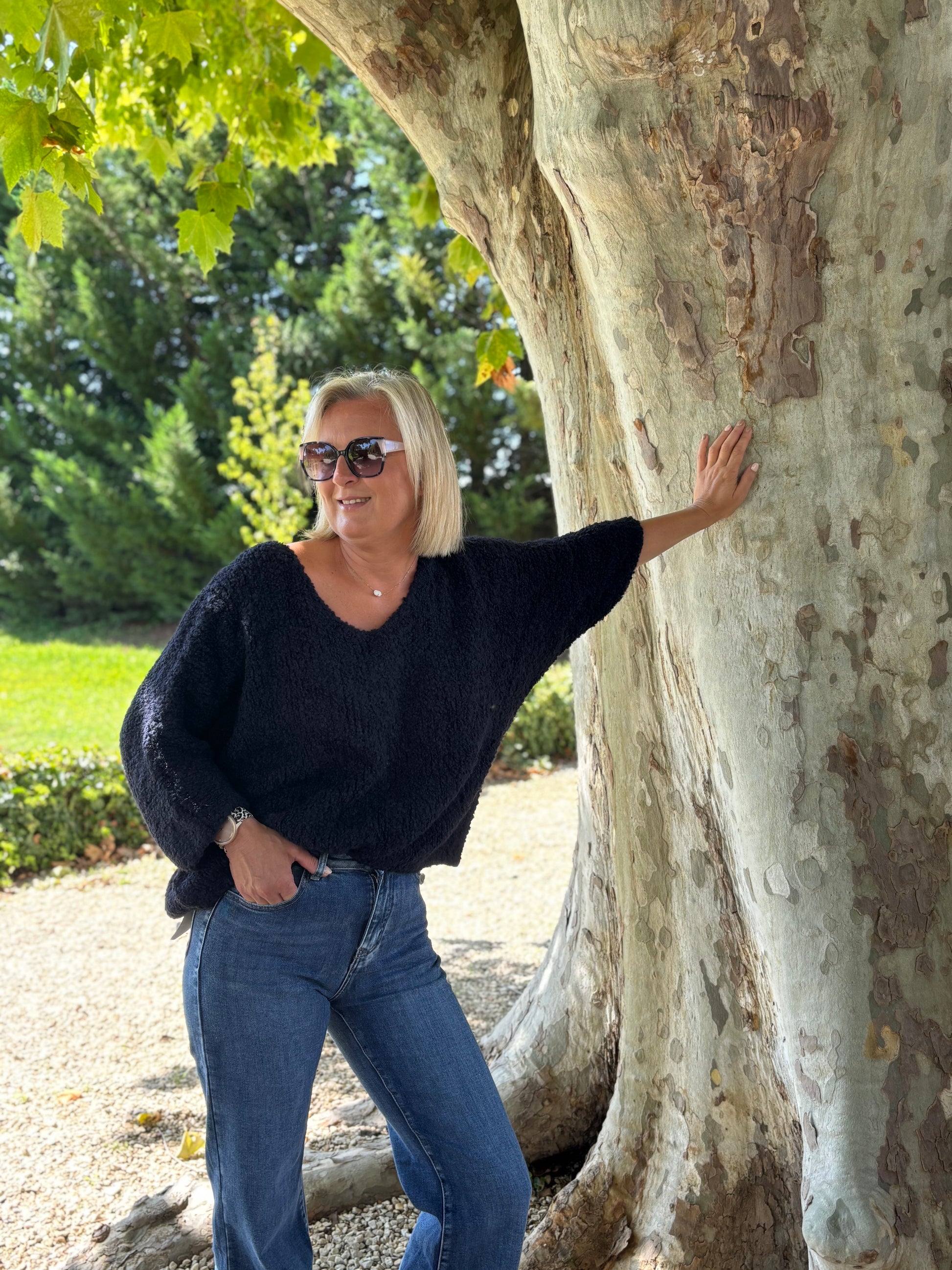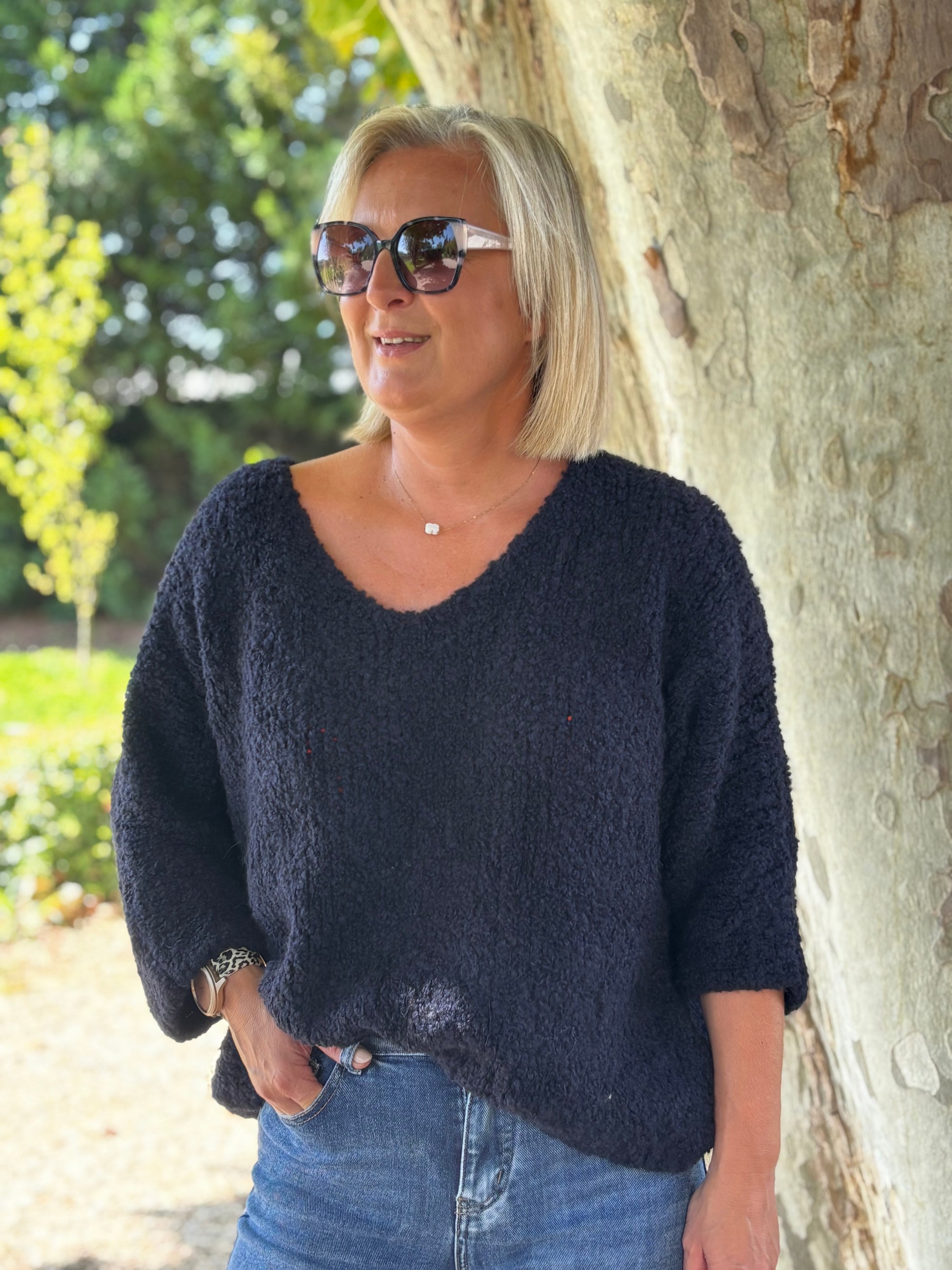 Pull maille bouclette, col V, coupe oversize, taille unique convient du 36 au 44. Existe en plusieurs coloris.