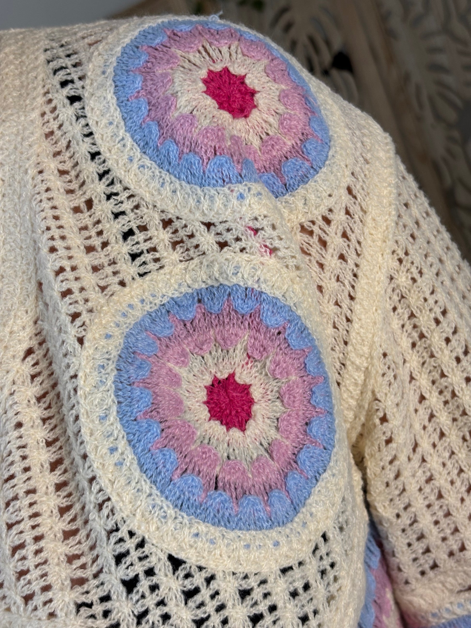 Pull court en crochet, blanc cassé avec motifs bleus et roses , ajouré. Manches un peu évasées sur le bas. Normal sur l'arrière. Taille unique convient du 34 au 40. Existe en 2 coloris.