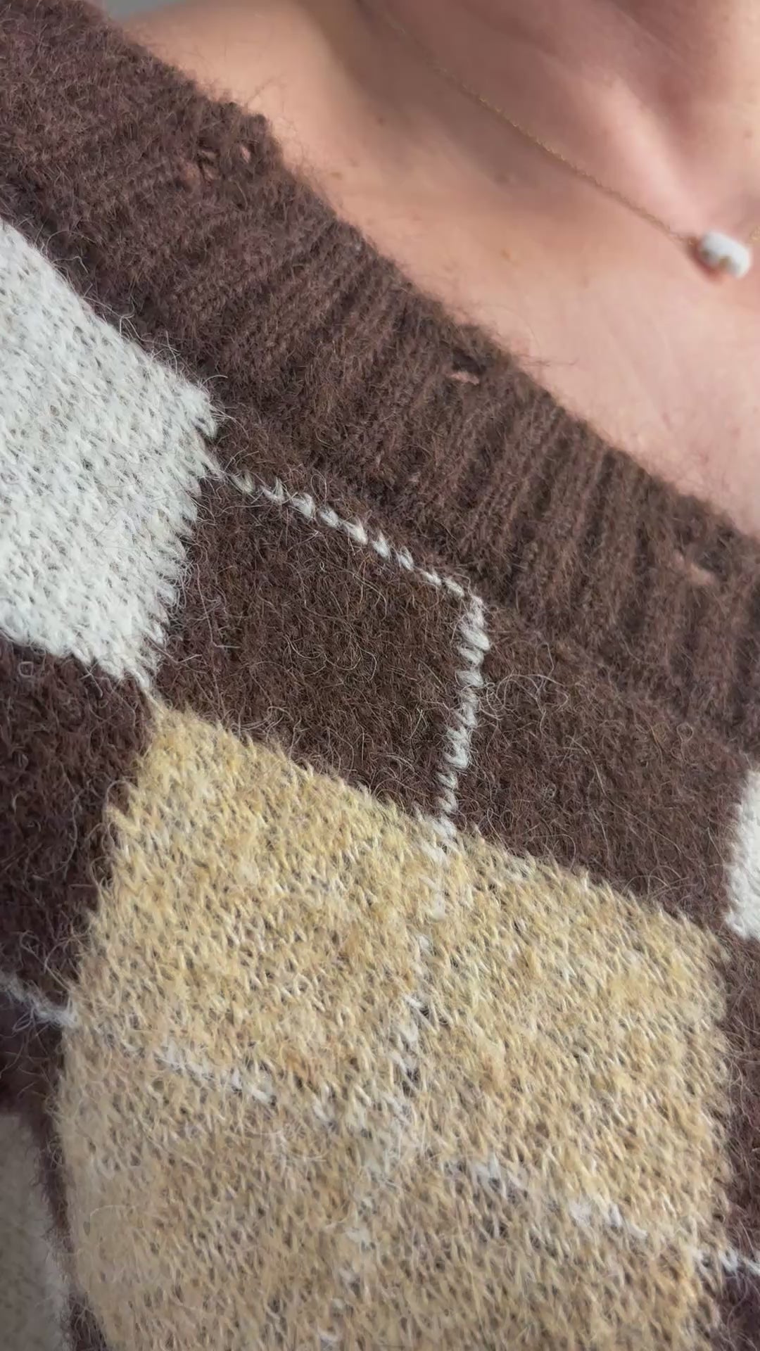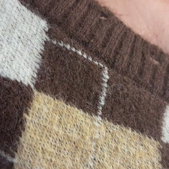 Pull en jacquard couleur chocolat, écru et beige, chaud, en lainage. Col V avec sur le col, le bas de manche et le bas du pull des sortes de trous. Coupe oversize. Taille unique convient du 36 au 44. Ne pique pas.