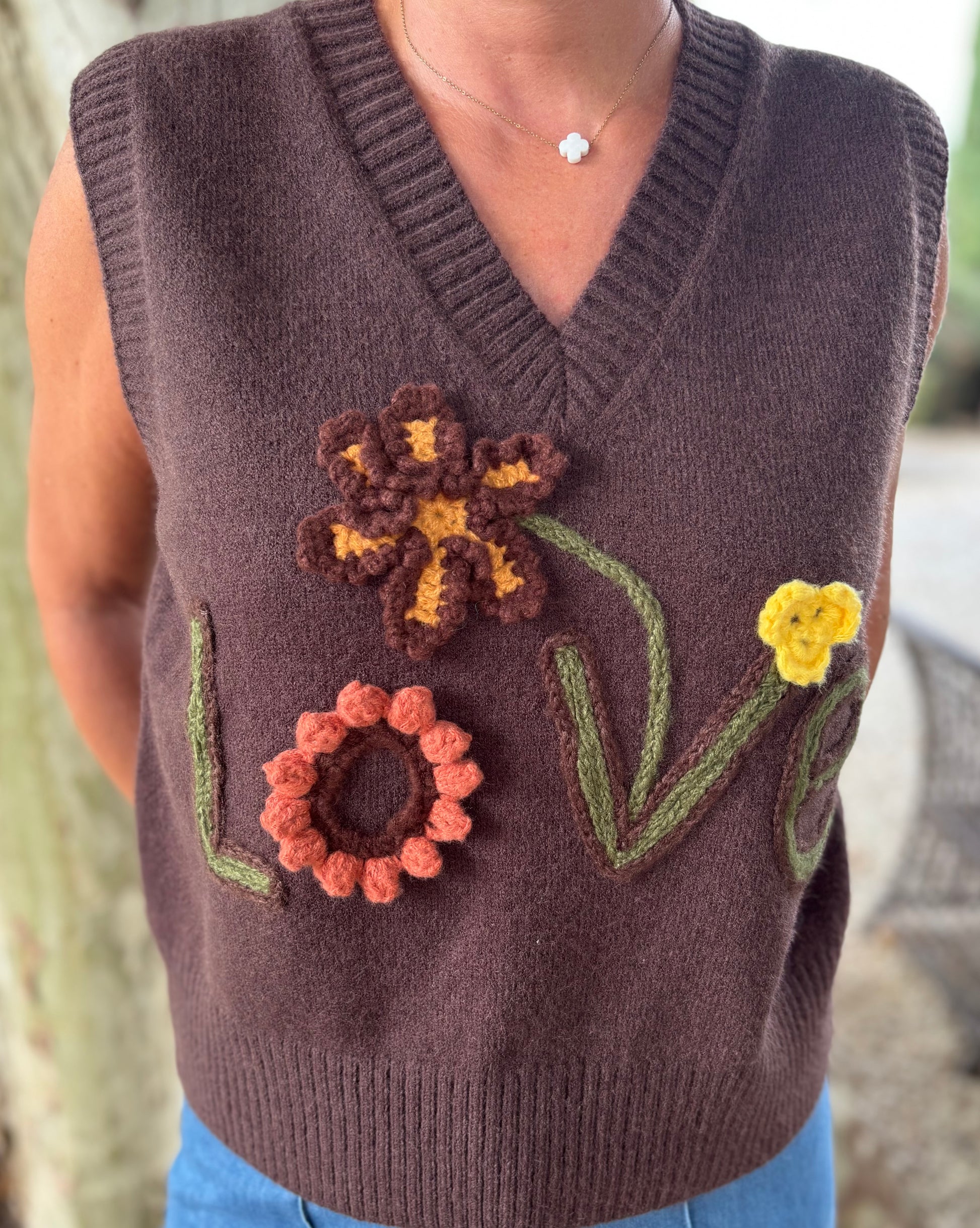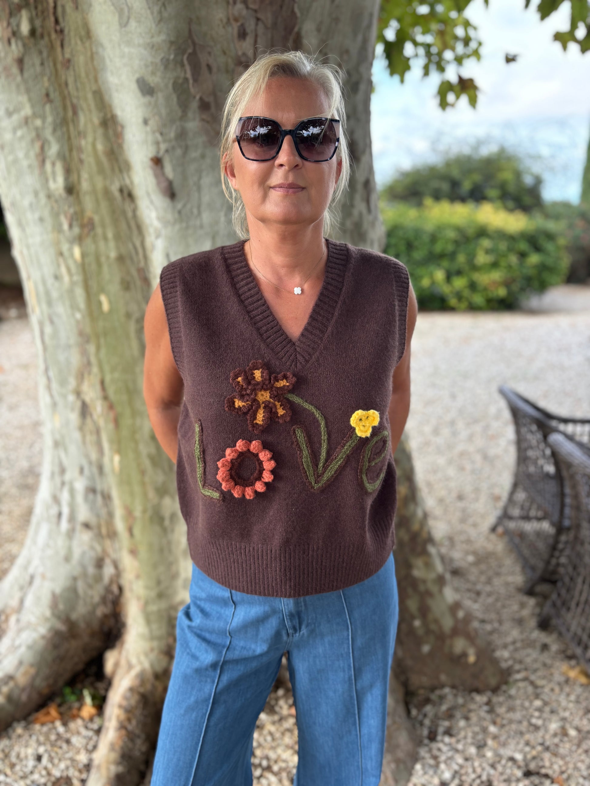 Pull sans manches en maille broderie love, col V, nuance automnale existe en 2 coloris. Taille unique convient du 36 au 40.