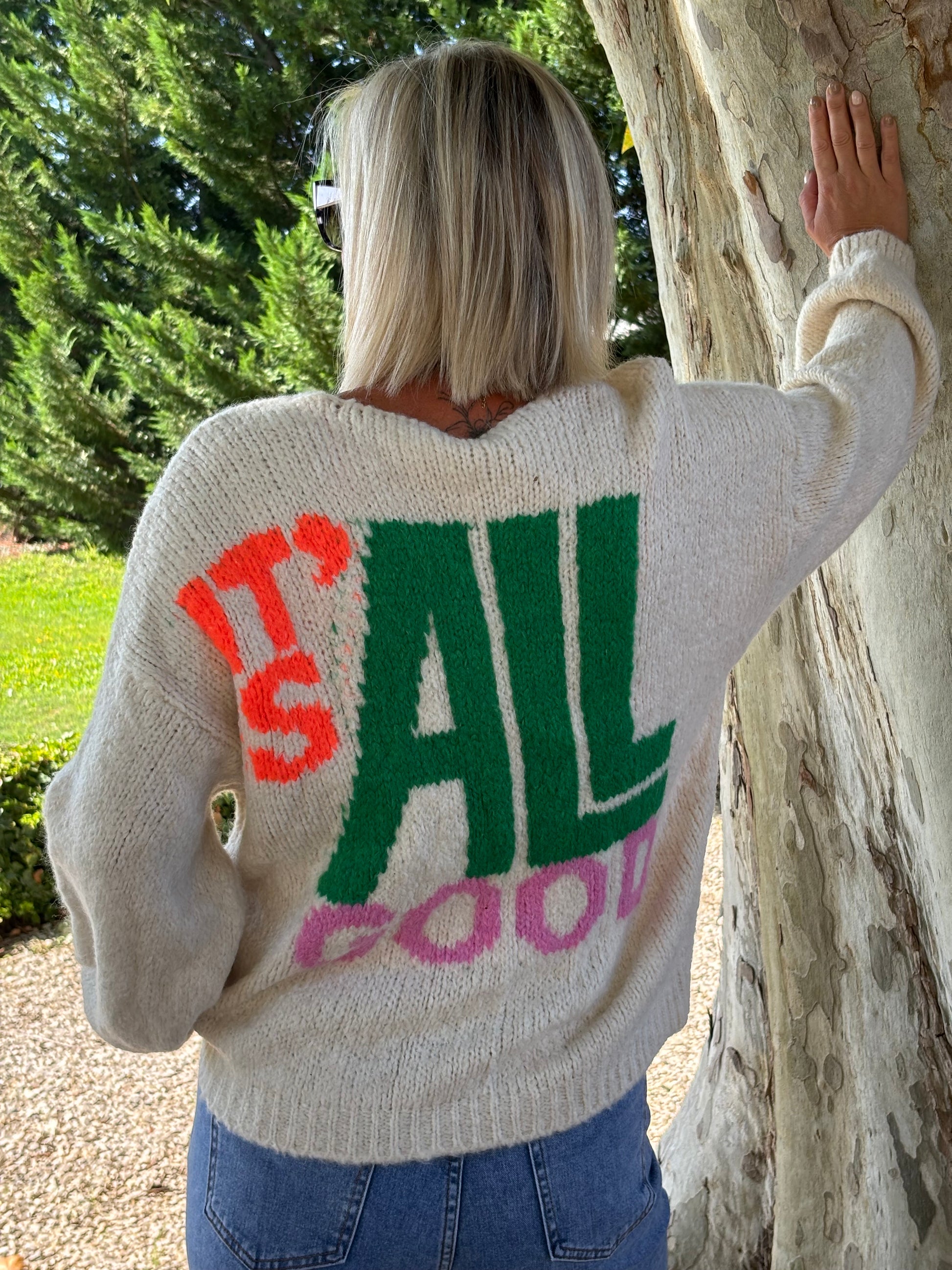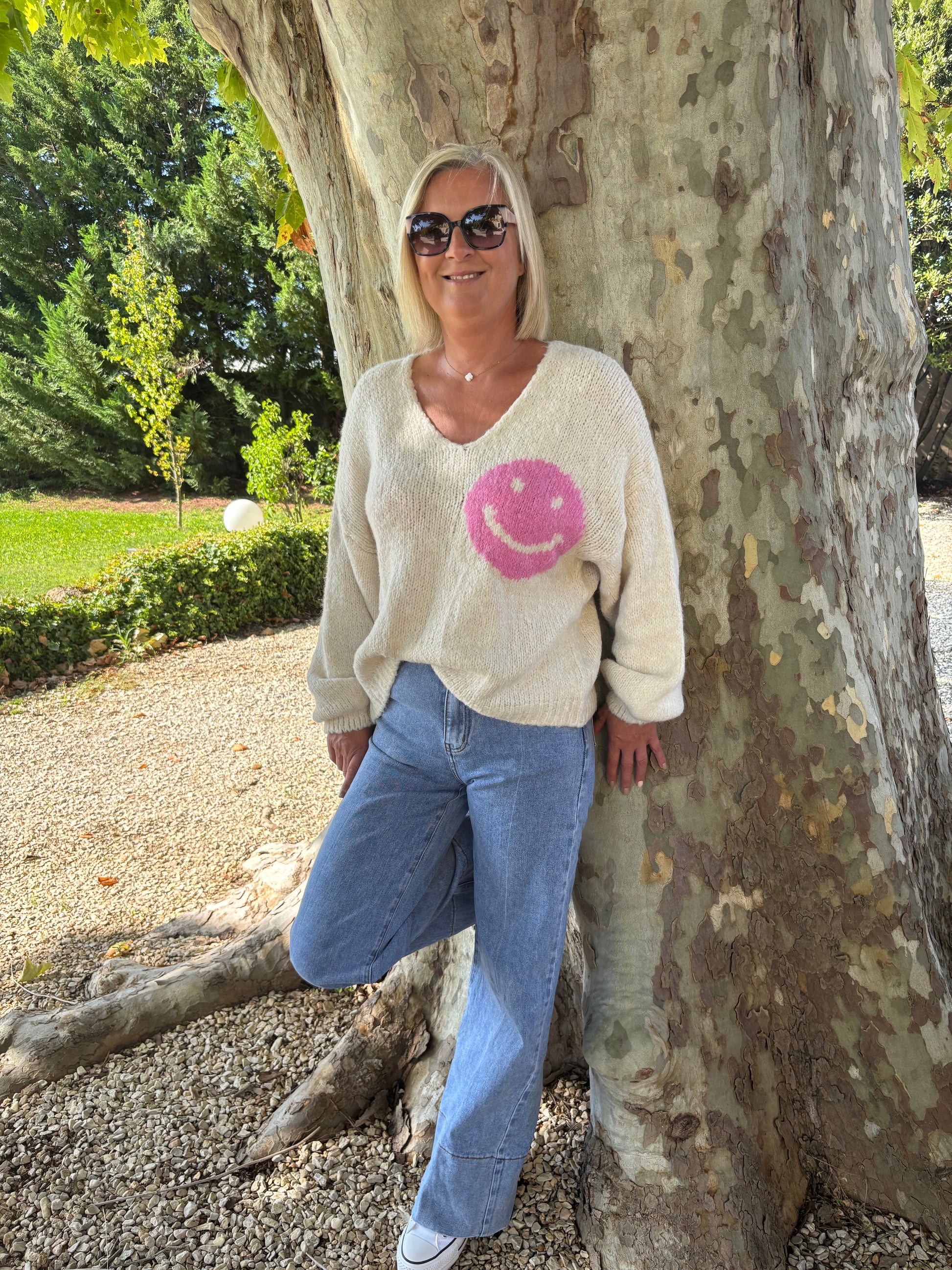 Pull en grosse maille, col V, avec une fantaisie smiley sur la poitrine et motif dans le dos. Existe en plusieurs coloris. Taille unique convient du 36 au 44. Très agréable à porter.