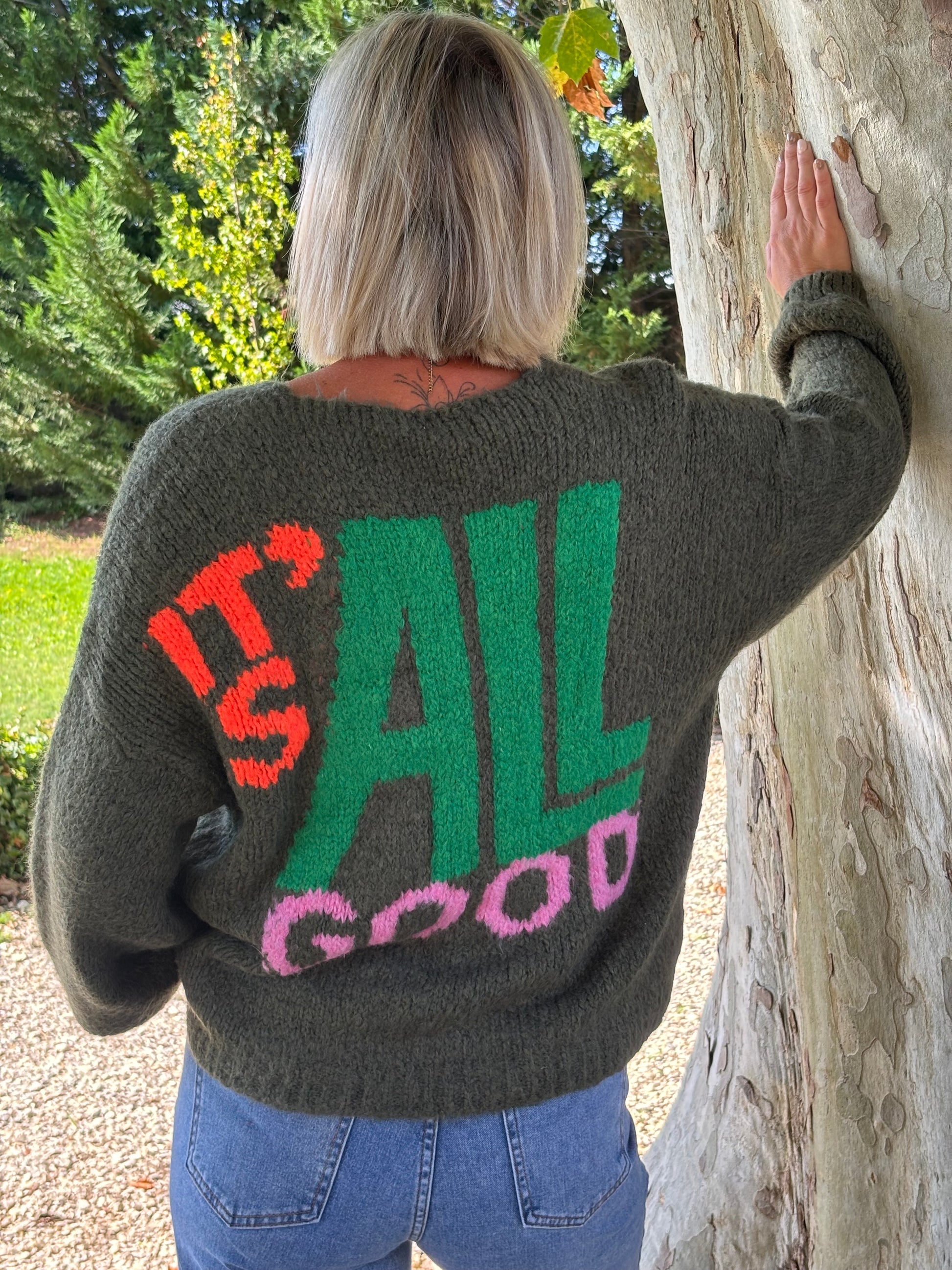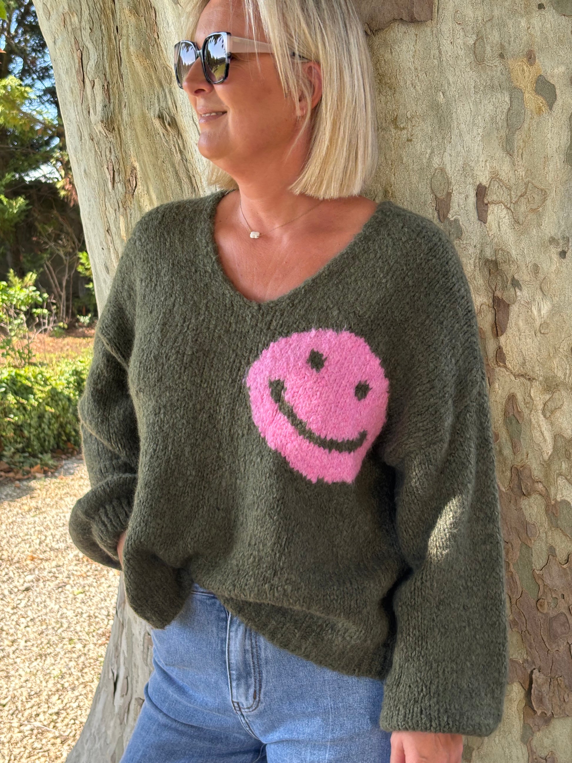 Pull en grosse maille, col V, avec une fantaisie smiley sur la poitrine et motif dans le dos. Existe en plusieurs coloris. Taille unique convient du 36 au 44. Très agréable à porter.
