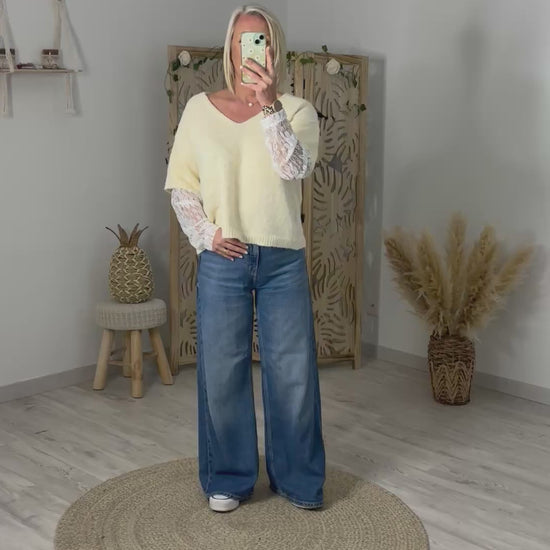 Pull manches courtes en maille avec manches en dentelle blanche. Col V. Existe en 2 coloris. Ne pique pas.