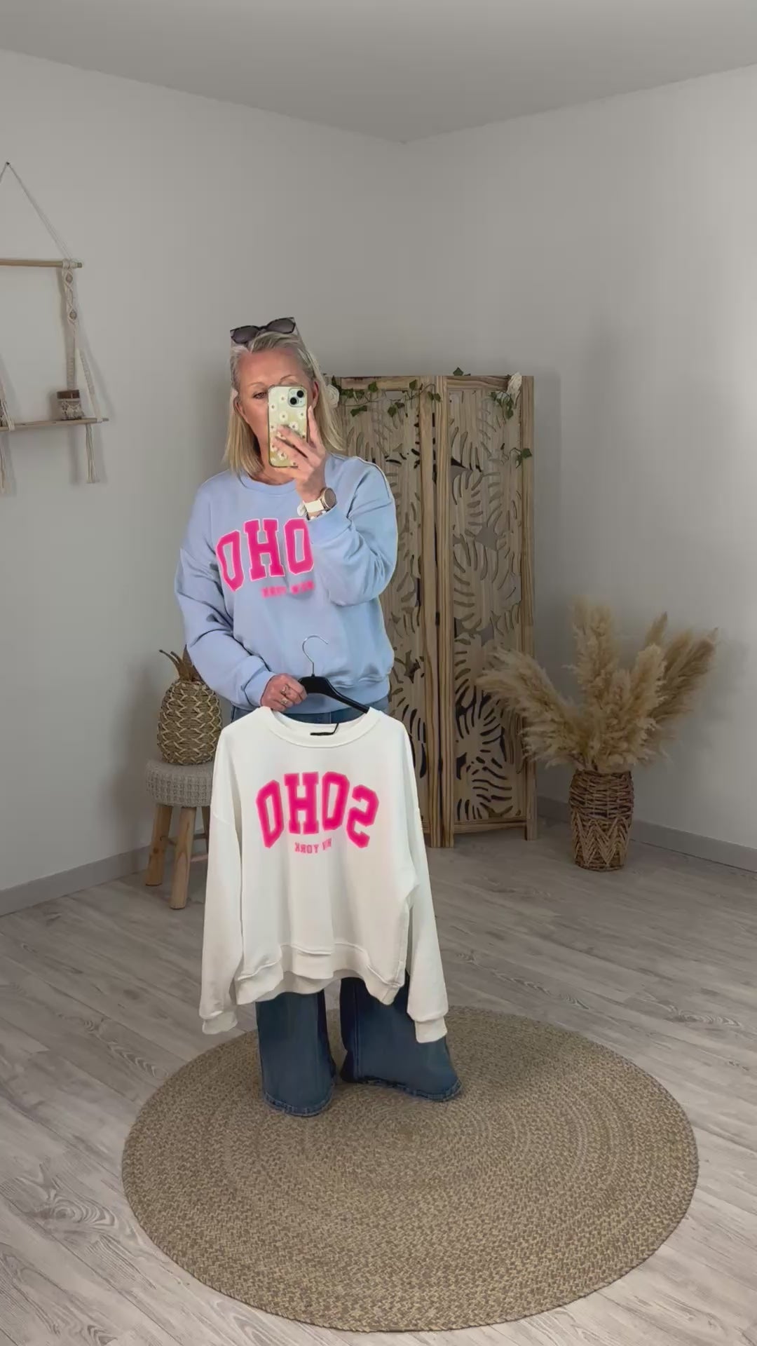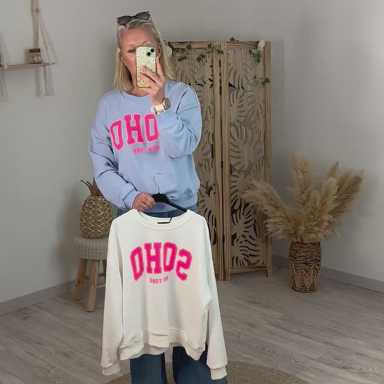 Sweat en coton avec inscription SOHO en rose fluo, col rond. Existe en 2 coloris. Taille unique convient du 34 au 42.