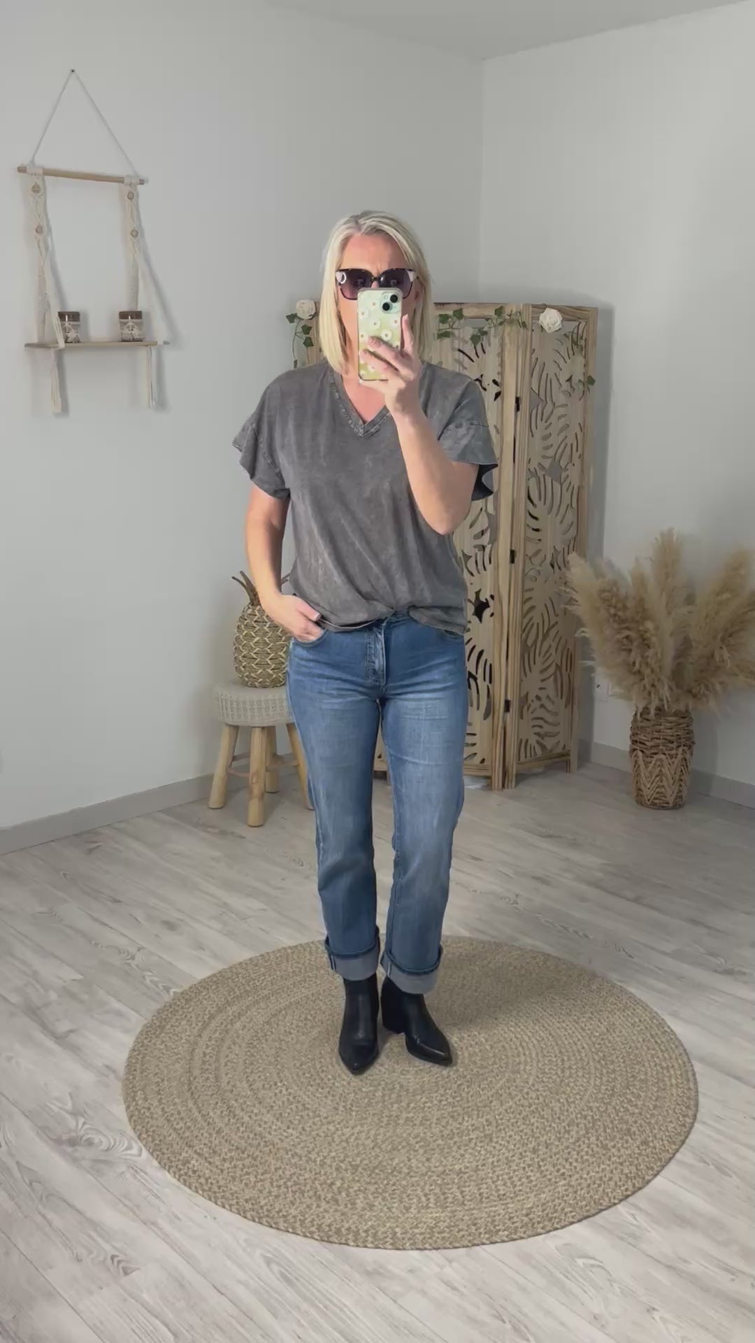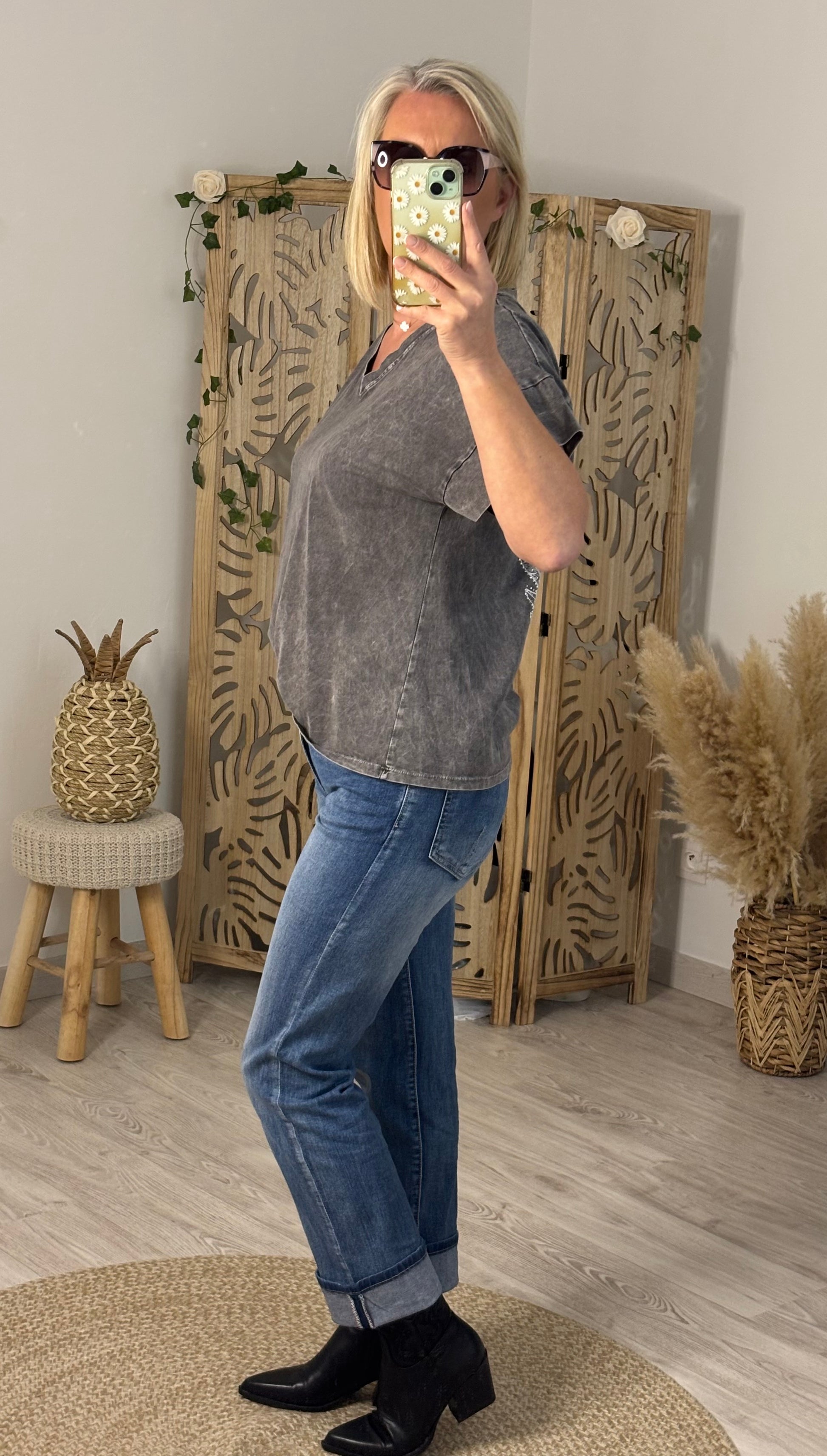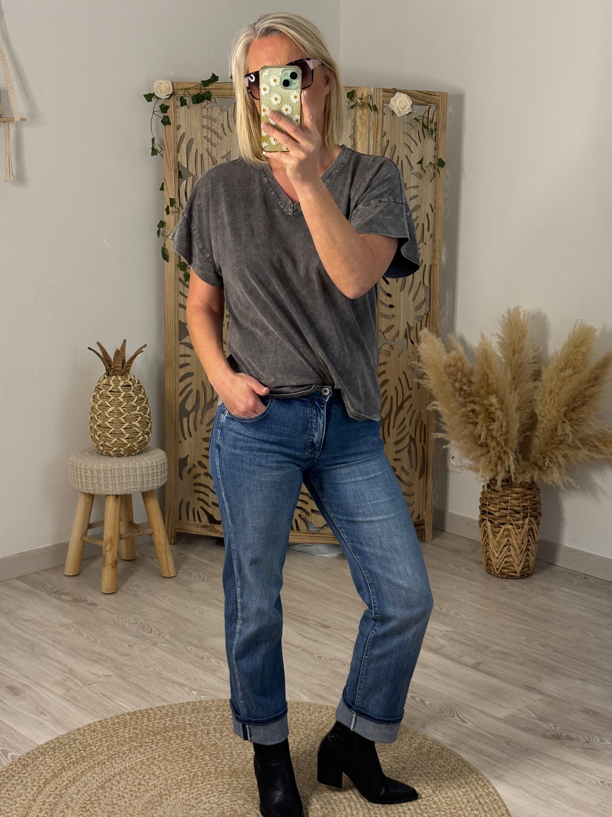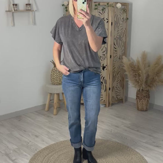 Tee shirt gris délavé en coton, col V, manches courtes structurées, avec motifs d'ailes avec strass dans le dos, inscription DREAMER couleur blanc. Taille unique convient du 36 au 42. Existe en 2 coloris.