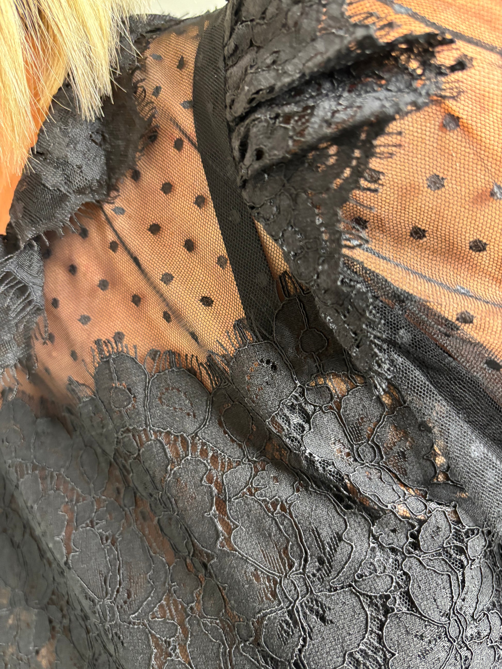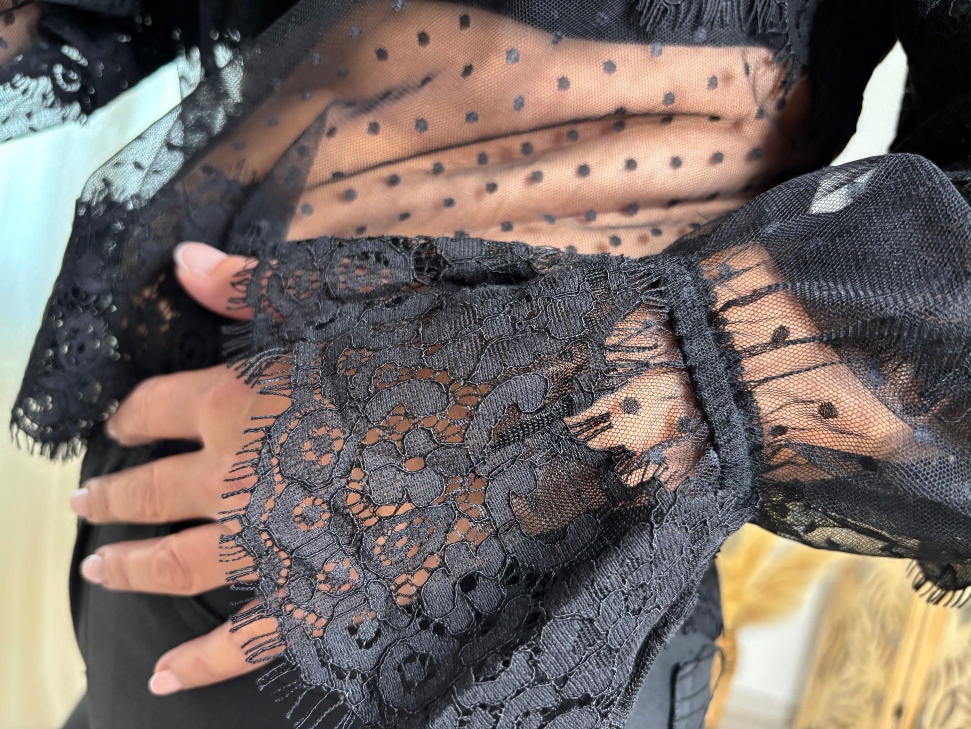 Tunique en dentelle et plumetis noire, col rond avec dentelle. Bas de manche resserrées par un élastique. Taille petit convient du 34 au 36. Très travaillé avec de la transparence.