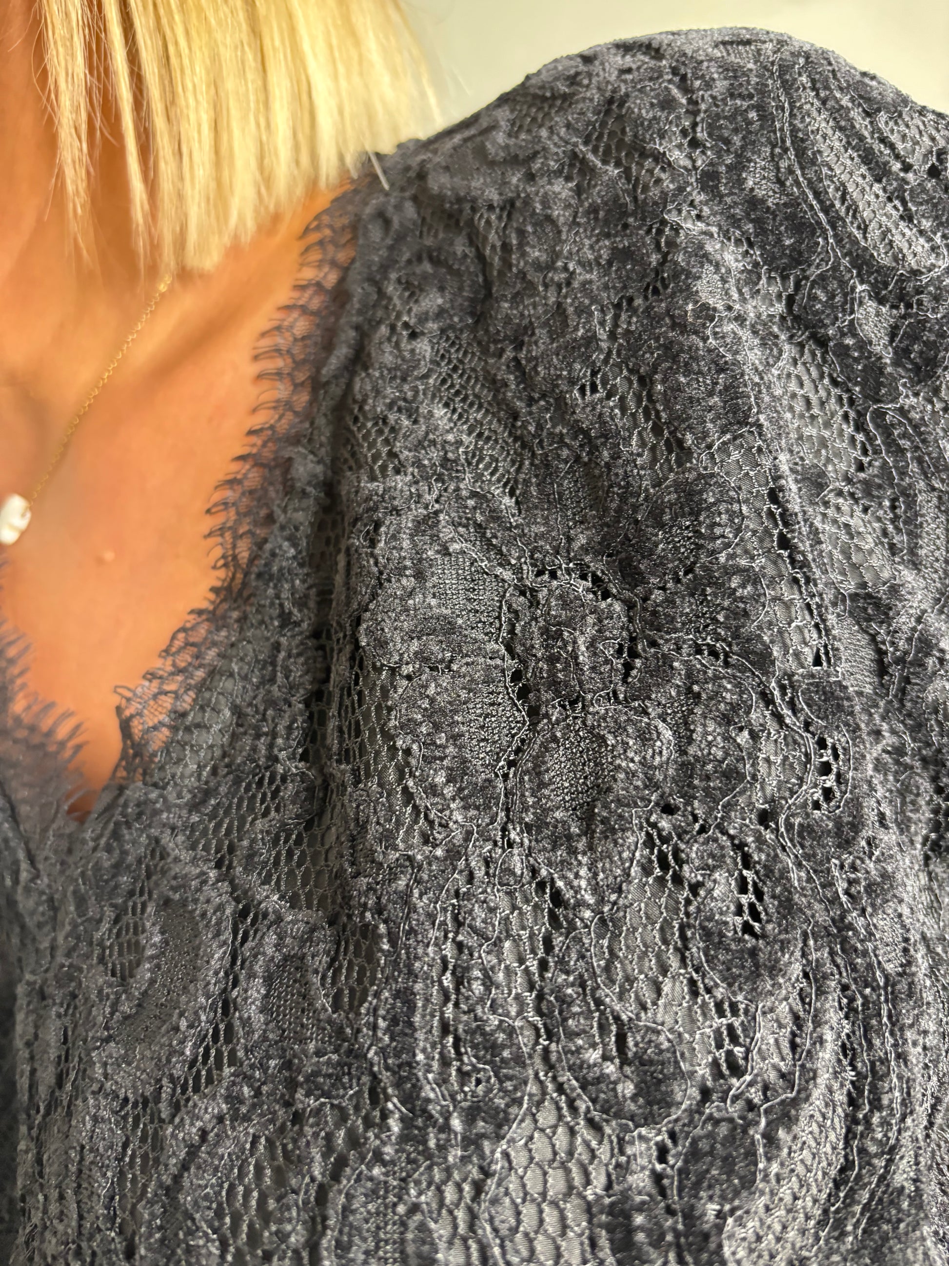 Tunique noire en dentelle et velours, col V, doublure sur le devant et tout en dentelle sur l'arrière. Existe en 2 tailles S/M et M/L. Convient du 36 au 44.