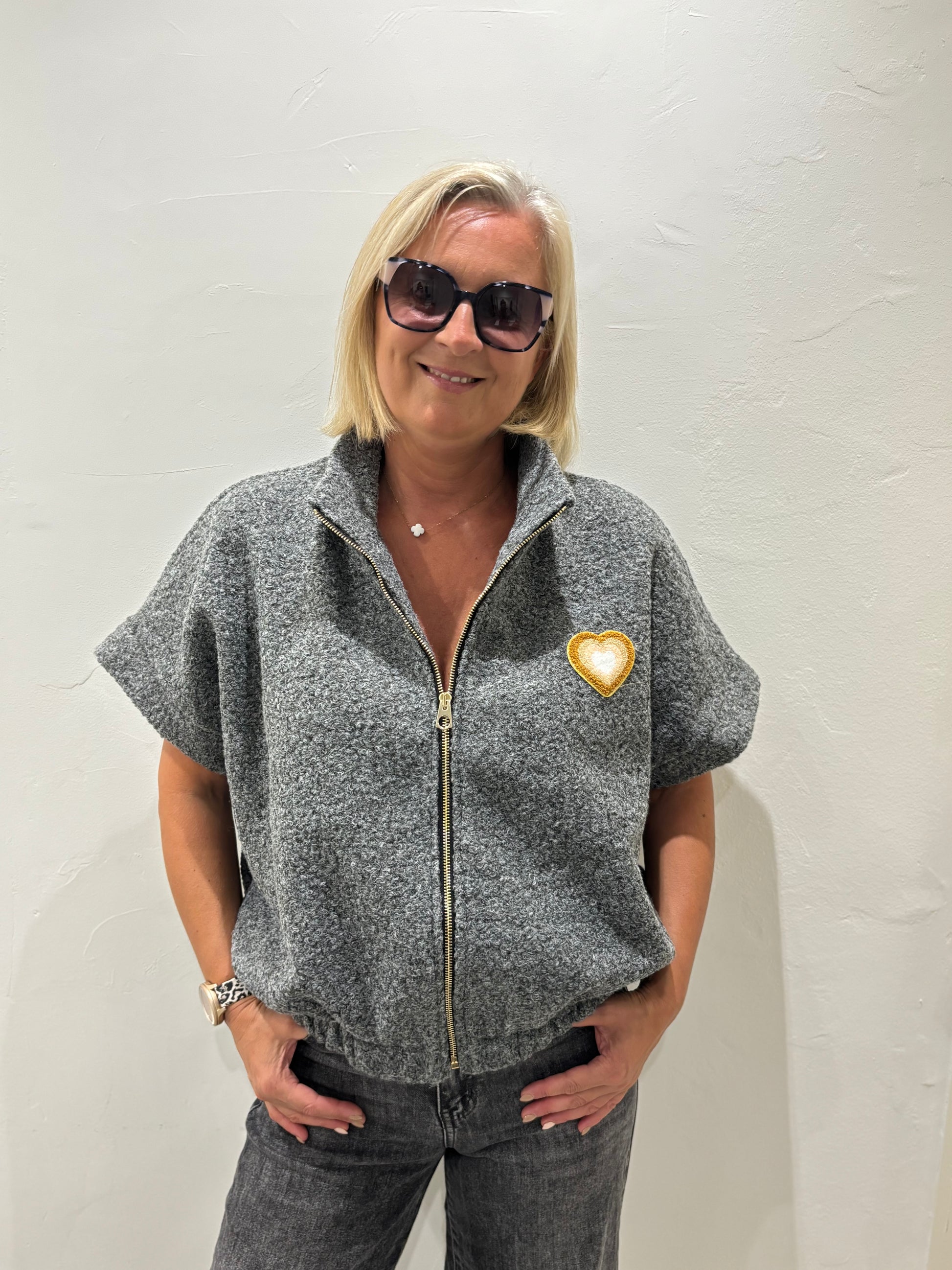 Veste manches courtes en laine bouillie avec motif coeur. Fermeture avec un zip. poches latérales. Taille unique convient du 36 au 40.
