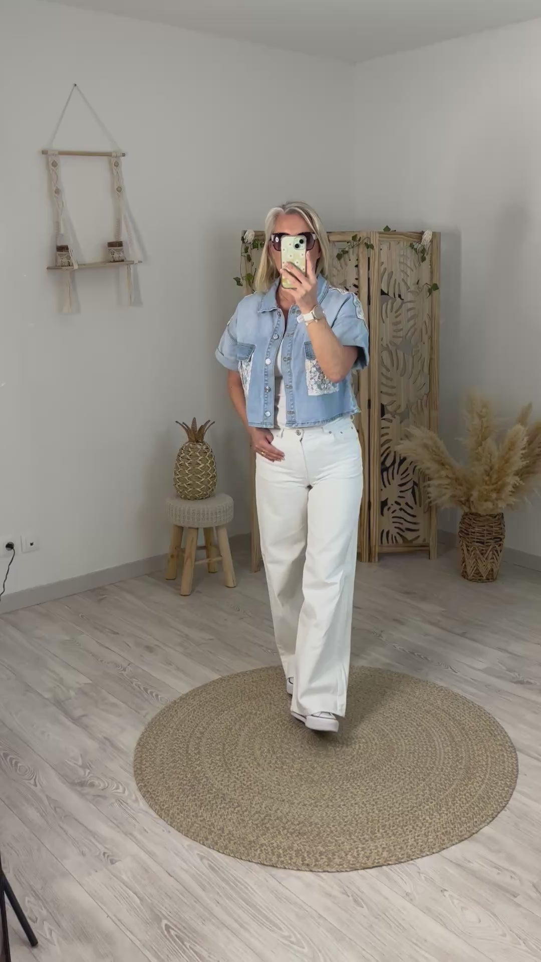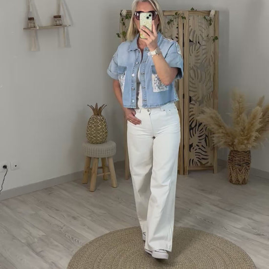 Veste courte en jeans bleu clair, manches courtes, 2 poches sur la poitrine avec des petites marguerites de couleurs pastels ainsi que sur le dos. Une taille de disponible S/M convient du 36 au 40. Coupe droite mais un peu large.
