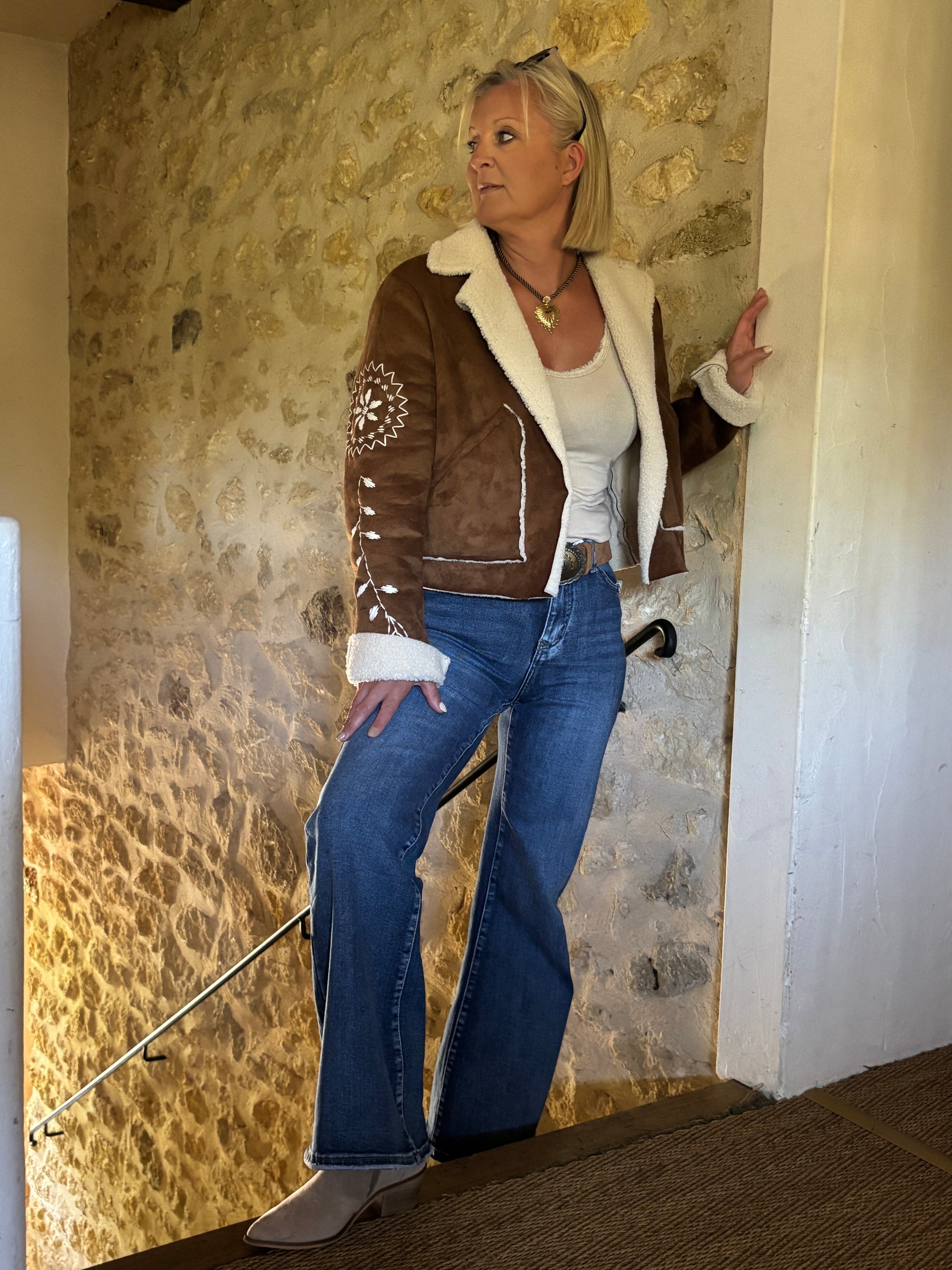 Veste en daim courte avec broderie sur la manche. Moumoute beige à l'intérieur, 2 poches sur le devant. Taille unique. Convient du 34 au 40 max.